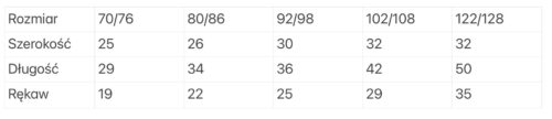 | Rozmiar | 70/76, 80/86, 92/98, 102/108, 110/116, 122/128 |