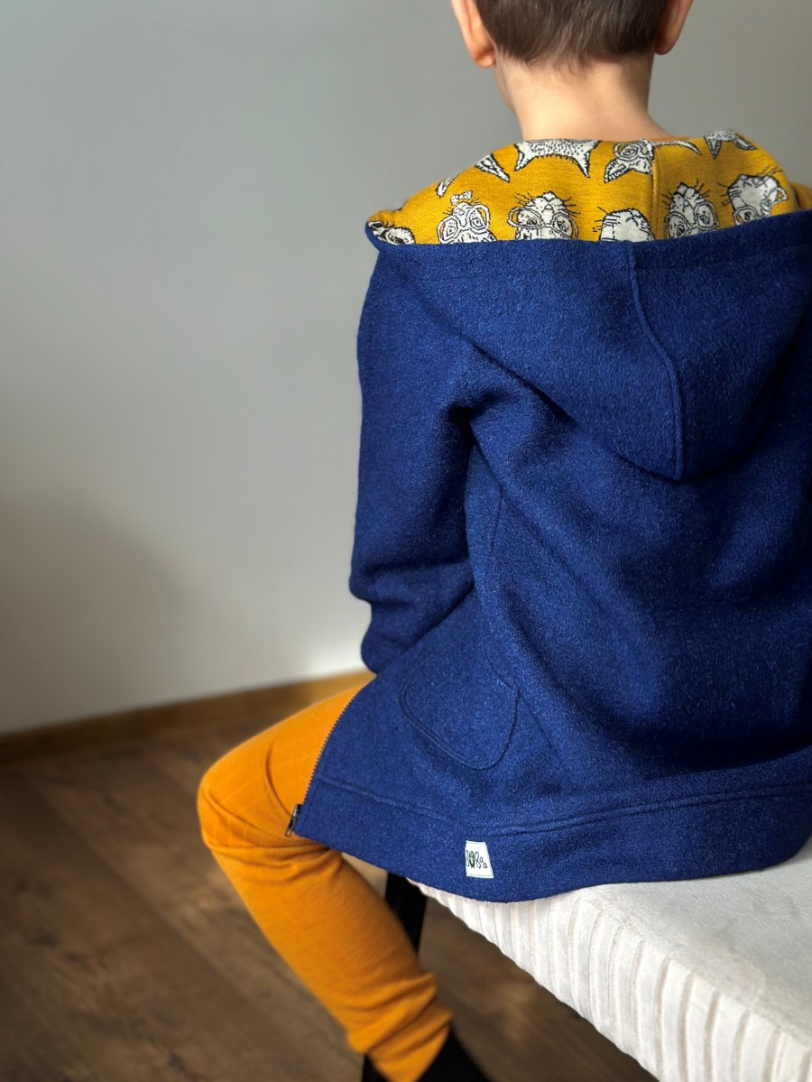 Kurtka dziecięca z granatowej wełny z merino podszewką w kapturze