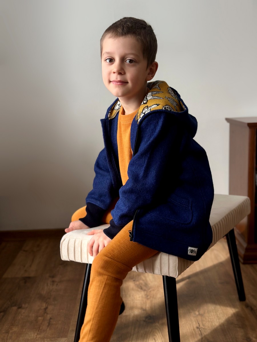 Stylowa i funkcjonalna kurtka dziecięca wykonana z wysokiej jakości wełny. Model w kolorze granatowym z kontrastową, wzorzystą podszewką.